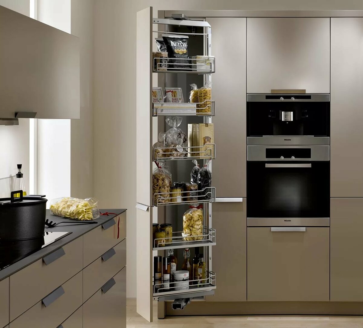 Особенно удачным данный дизайнерский подход будет для объединенных помещений и студий. Буфетные полки интегрируют кухню в обеденную зону, совмещают ее с уголком для релакса. Комната, даже если она очень большой площади, обретает более целостный облик. Это удобно и с практической точки зрения – на полках можно разместить вещи, которыми часто пользуются, например, чашки или крышку для пирогов.