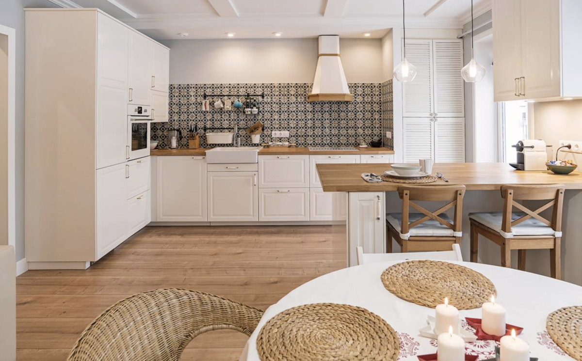 Кухня данной стилистики предполагает хорошее освещение, которое достигается и за счет подсветки, и с помощью светлых расцветок фасадов. Шкафчики функциональны, вместительны, с продуманной конструкцией – на столешнице остается лишь самое необходимое, все остальное хранится внутри.