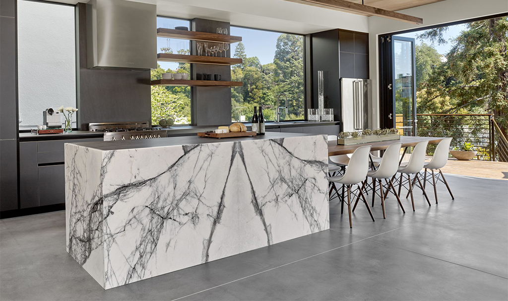 Мрамор востребован в интерьере, он словно светится изнутри, привнося в помещения изысканность. Прекрасные прожилки складываются в неповторимый узор, неизменно привлекающий взор. Кроме того, у этой горной породы отличная износостойкость и прочность. Поверхность не имеет пор, следовательно, можно не бояться появления плесени и бактерий, за счет прожилок на ней не видны разводы, а загрязнения легко смыть водой. Для кухонных столешниц и фартуков мрамор подходит превосходно – материал служит сотню лет, подлежит ремонту, гигиеничен.