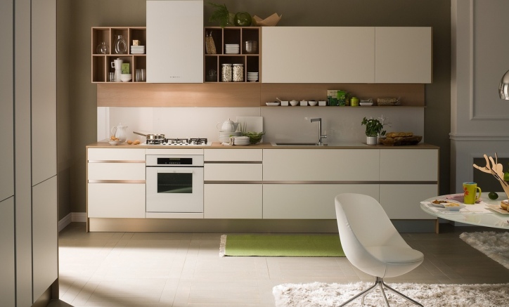 Современная невысокая кухня. Фасады МДФ, облицованы белым, матовым пластиком. Есть несколько открытых верхних шкафов и открытая полка в районе фартука. Что позволяет быстрее воспользоваться кухонными принадлежностями и создают уют. Ящик по мойкой со специальной выемкой под сифон позволяет легко и быстро воспользоваться мусорными контейнерами.