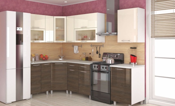 Уютная угловая кухня с угловой мойкой. Глянцевые фасады двух цветов. Достаточное количество стеклянных шкафчиков. Вместо цоколя декоративные матовые ножки.