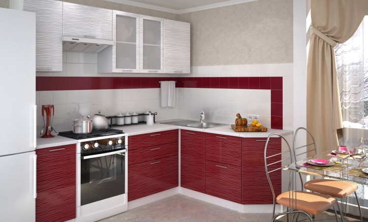 Небольшой набор кухонной мебели с сочетанием цветов белого и благородного бордового. Верхние модули только по одной стене. Нижний модуль с кошен для свободного прохода к балкону.