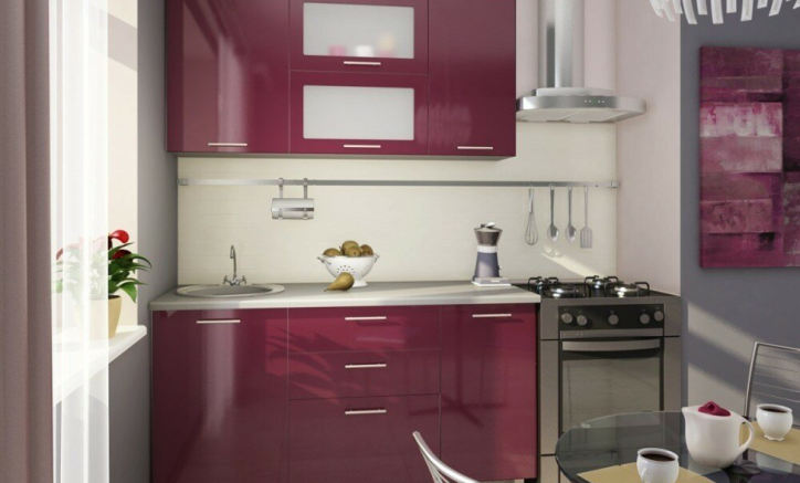 Небольшая кухня подойдёт для маленького помещения или квартиры студии. Фасады тёмно-бордового цвета придают элегантный вид. Декоративные регулируемые опоры сочетаются с ручками, придают воздушность и доступ для уборки.