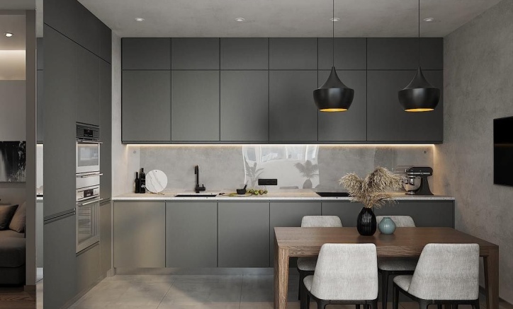 Набор мебели с вместительными пеналами под встраиваемую технику. Шкафы строгой формы, без выступающих ручек, в тёмно-серой цветовой гамме прекрасно впишутся как в современный стиль помещения, так и стиль лофт.