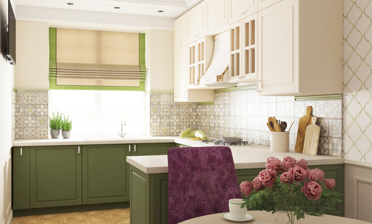 Кухня выполнена в кантри стиле. Молочный цвет фасадов, характерный для этого стиля прекрасно сочетается с зелёным, природным цветом. Небольшой полуостров позволяет отделить кухонную зону от пространства гостиной или столовой.