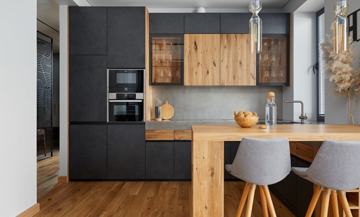 Кухня выполнена в современном стиле. Фасады в стиле Лофт «Бетон Чикаго» контрастируют с природными тонами дерева. Алюминиевые рамки чёрного цвета и черные ручки только подчёркивают этот контраст.
