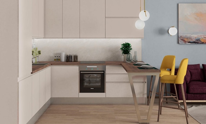 Комплект современной мебели с барной стойкой может быть хорошим решением для квартиры студии. Предусмотрен пенал для встраиваемого холодильника. Фасады без выступающих ручек. Мебель спокойного, бежевого оттенка на контрасте со столешницей под тёмное дерево.
