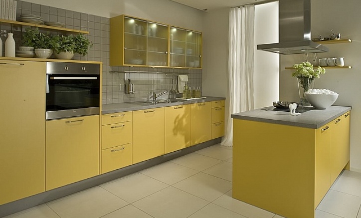 Невысокая кухня с полупеналами. Верхние модули не занимают всю стену и со стеклянными фасадами, что не перегружает пространство. Полуостров можно использовать с двух сторон. Яркий, жёлтый цвет фасадов наполняет помещение солнечным светом.