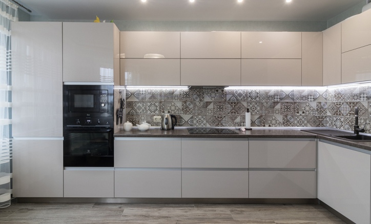 Белоснежная глянцевая мебель – украшение любого интерьера. Все нижние модули с выдвижными ящиками, что упрощает доступ к их содержимому. Верхние фасады поддерживают горизонтальное расположение нижних фасадов. Фартук из стеновой панели с рисунком кафельных плиток акцентирует на себе внимание и прекрасно перекликается с цветами пола.