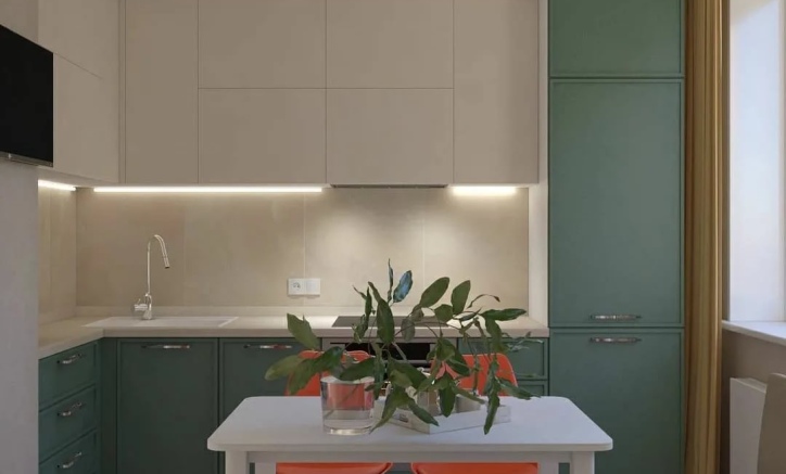 Современная кухня с пеналом под встраиваемый холодильник. Верхние шкафы под потолок без выступающих ручек. Современные механизмы позволяют открывать фасад путём нажатия.