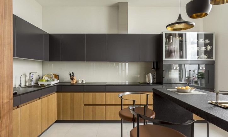 Набор мебели с пеналами под встраиваемую технику, с витринами под посуду. Подходит для помещений, оформленных в стиле лофт. Фасады без выступающих ручек. Сочетание цветов дерева с чёрным подчёркнуто чёрной техникой.