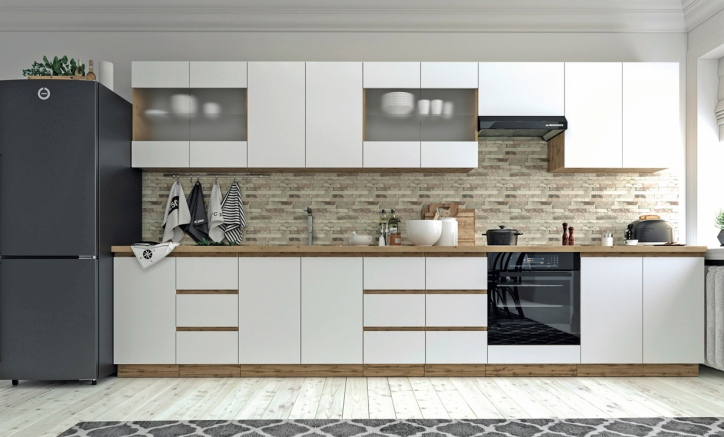 Мебель расположена вдоль одной стены. Фасады без выступающих ручек. Сочетание дерева и белого цветов подойдут для помещения в скандинавском стиле. Набор мебели можно сократить для более маленьких помещений.