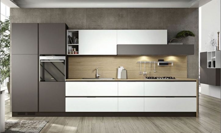 Современный дизайн кухонной мебели подойдёт и для помещений, оформленных в стиле лофт. Фасады без выступающих ручек, большие, вместительные ящики.