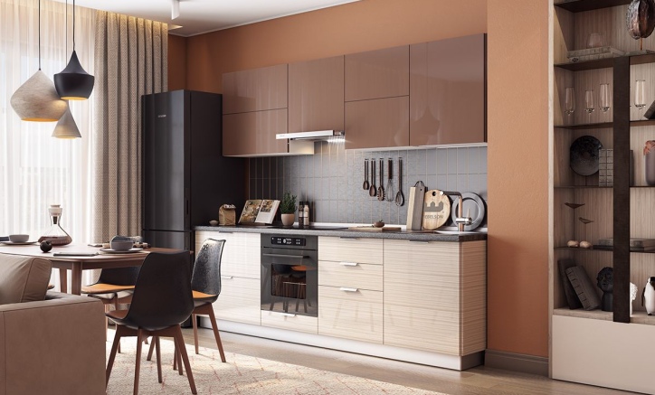 Современная невысокая кухня. Фасады МДФ, облицованы глянцевым пластиком. Прекрасно подойдёт для маленького помещения или квартиры- студии. Большое количество ящиков комфортно в использовании. Тёплые шоколадные оттенки хорошо сочетаются с чёрной стильной техникой и кафелем на стене.