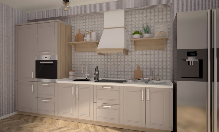 Набор кухонной мебели подойдёт для помещения, оформленном в стиле «кантри». Два вместительных пенала позволяют оставить свободной остальную часть стены, украсив её лишь открытыми полками с декоративной посудой.