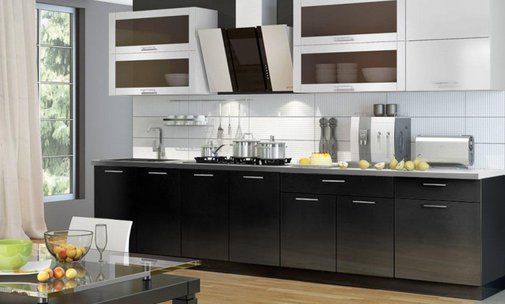 Классическое сочетание белого и чёрного. Большое количество шкафчиков со стеклом «оживляет» пространство кухни. Мойка и варочная поверхность с одной стороны столешницы освобождает большую единую рабочую зону с другой стороны.