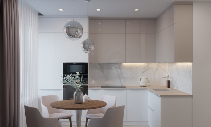 Глянцевая мебель всегда смотрится более привлекательнее. Данный комплект включает в себя два пенала под встраиваемую технику, выдвижную корзину, ящики и место под посудомоечную машину. Верхние шкафы под потолок с двумя ярусами фасадов.