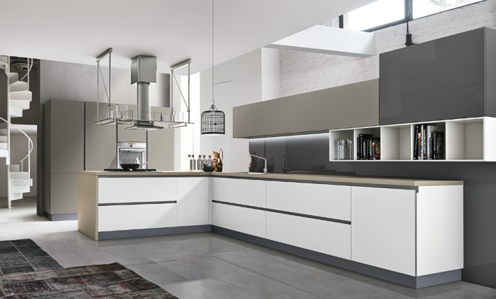 Набор кухонной мебели с четырьмя пеналами под встроенный холодильник и духовой шкаф, фасады без выступающих ручек, очень большие, вместительные ящики, использование трёх монохромных цветов. Прекрасно подойдёт, как для помещения в стиле модерн, так и для лофт стиля.