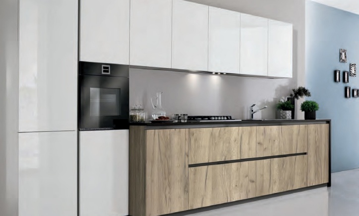 Набор кухонной мебели с двумя пеналами под встроенный холодильник и духовой шкаф. Фасады без выступающих ручек. Под дерево нижние модули с чёрной рабочей зоной. А верхние модули одной высоты и являются продолжением белых пеналов. Очень большие, вместительные ящики.