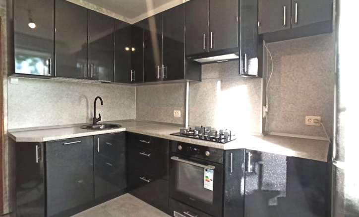 Современная кухня с фасадами в стильном чёрном глянце. Легко подобрать встраиваемую технику и мойку в чёрном цвете. Удачное решение для перепада глубины стен – скошенные модули.