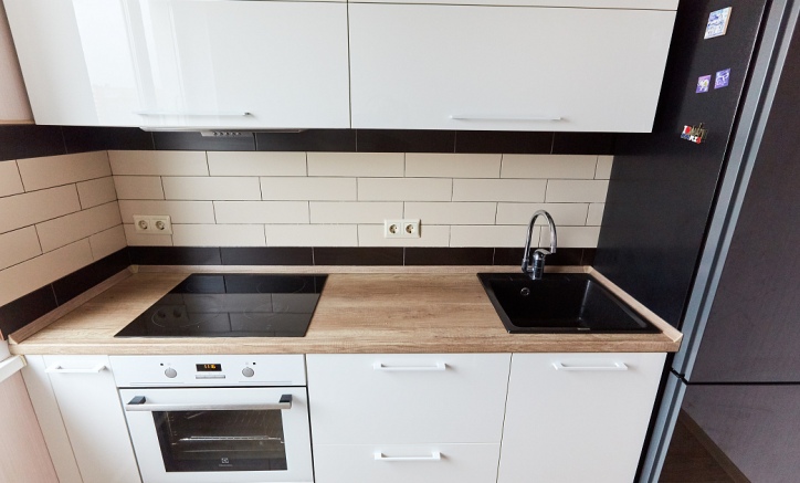Белый глянец с белыми ручками. Чёрная техника в сочетании со столешницей «под дерево». Современные подъёмные механизмы, бутылочница. Маленькая, но уютная светлая кухня подойдёт для квартиры студии.