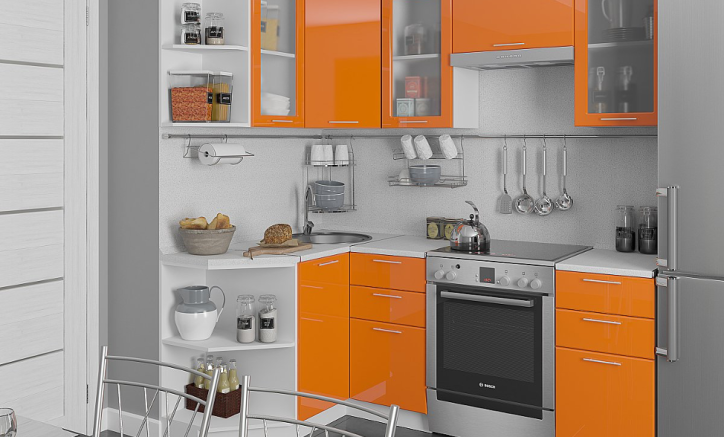 Компактный набор кухонной мебели в современном стиле подойдёт для маленького помещения или квартиры студии. Яркий цвет фасадов контрастирует со спокойным интерьером в светло-серых тонах. Прекрасно вписалась техника из нержавейки.