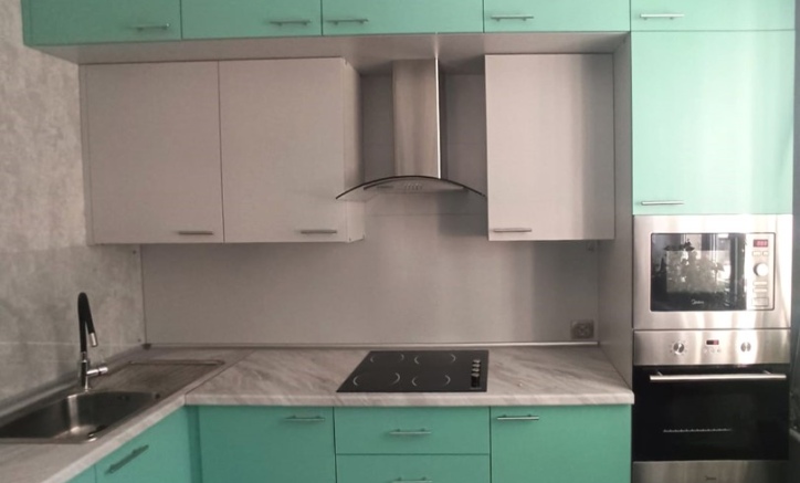 Верхние модули мебельного гарнитура выполнены в два яруса и установлены максимально под потолок, занимая только одну стену. В качестве фартука выбраны два материала: по одной стене стеновая панель, а по другой стекло.