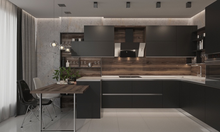 Кухня в стиле Модерн с дополнительной обеденной зоной. Функциональная рабочая зона. Наличие открытых полок не перегружает пространство. Красивое сочетание насыщенной текстуры дерева с тёмными фасадами и светлой столешницей.
