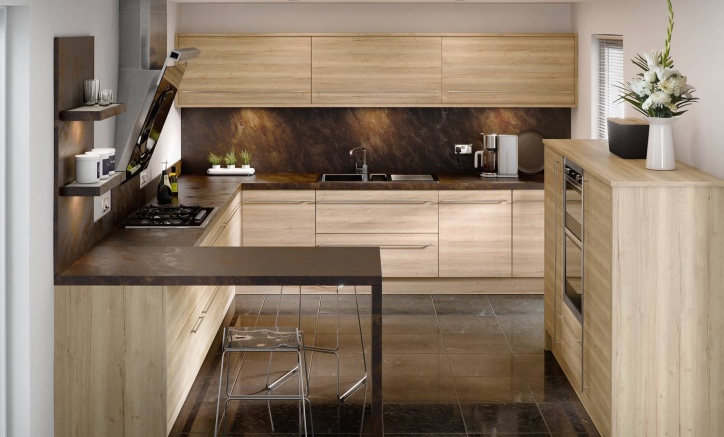 Большая, просторная, современная кухня в тёплых тонах светлого дерева с небольшой барной стойкой. Фактурная столешница и фартук из стеновой панели под винтажный камень создают контраст. Облегчённый верх не перегружает пространство с низким потолком, а дополнительный, невысокий шкаф позволяет разместить часть кухонной техники.