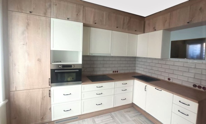 Набор мебели с пеналами под встраиваемую технику. Верхние модули в два яруса. Большое количество ящиков. Сочетание в материалах всего двух цветов: молочный и древесный.