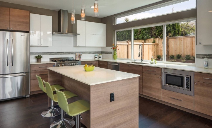 Кухонный набор мебели для большого загородного помещения. Остров используется, как рабочая поверхность, так и обеденная зона. Цвета материалов прекрасно сочетаются с техникой из нержавейки.