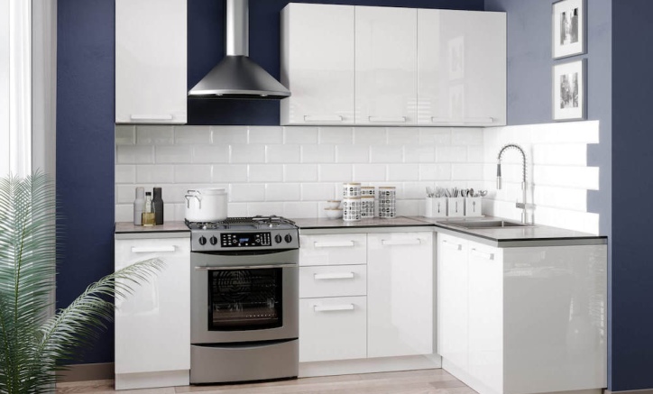 Современная мебель в белом глянцевом цвете подойдёт и для помещения в скандинавском стиле. Верхние модули занимают только одну стену. Белые ручки не выделяются на фоне фасадов и располагаются горизонтально.