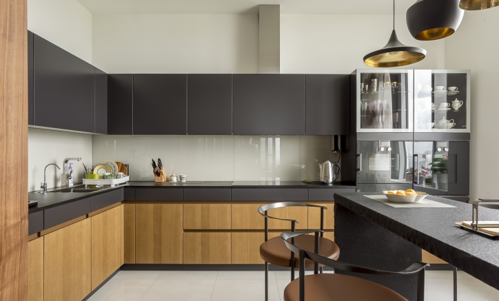 Большая просторная рабочая зона, пеналы со встраиваемой техникой. Нет лишних тонов. Только дерево и графит. Тёмные цвета фасадов не перегружают пространство, потому что невысоких размеров. А стеклянные шкафчики и стеклянный фартук дополняют воздушности.