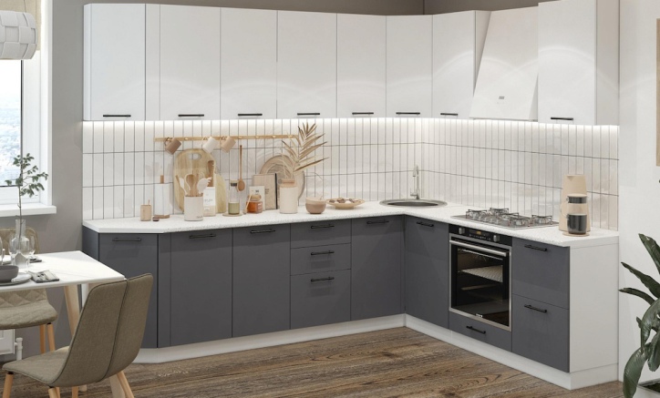 Светлый верх и тёмный низ. Большая светлая рабочая зона. Контрастные чёрные ручки. Левый край кухни у окна закончен скошенными модулями.