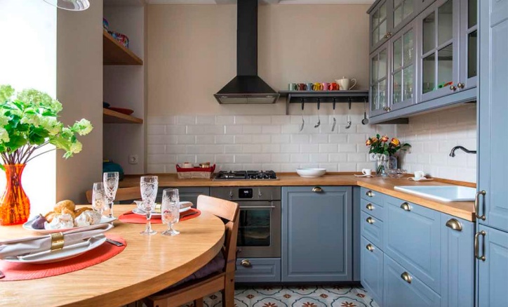Кухня в стиле «прованс» с большим количеством стеклянных шкафчиков по одной стене. Состаренные ручки и деревянная столешница выделяются на фоне фасадов.