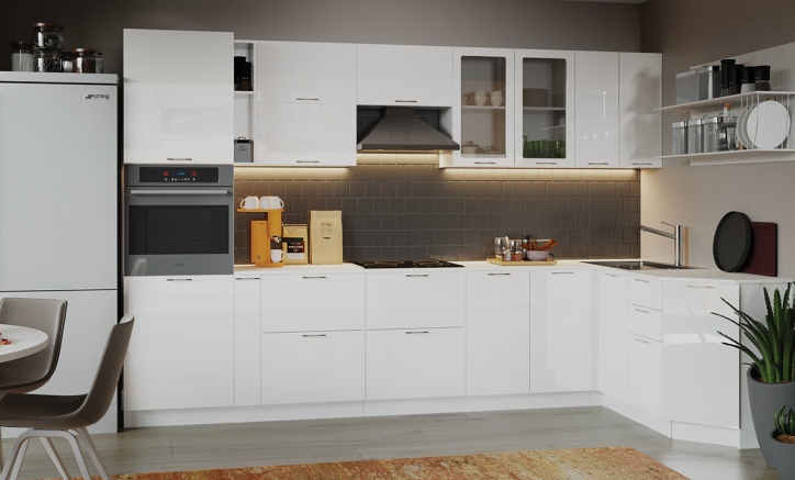 Полностью белоснежная кухня в глянце добавит света даже в тёмном помещении. Пенал, бутылочница и достаточное количество ящиков. Модуль со стеклом заменит небольшой сервант.