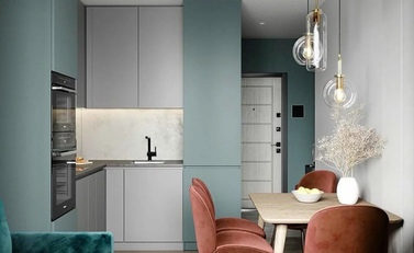- Малахитовый, изумрудный и морской зеленый цвета отлично смотрятся в классических кухнях. Да-да, классика — это вовсе не обязательно оттенки коричневого, глубокие и сложные зеленые тона зачастую выглядят эффектнее и придают кухне еще более роскошный вид.