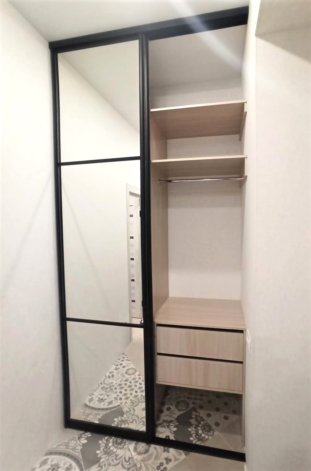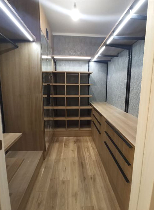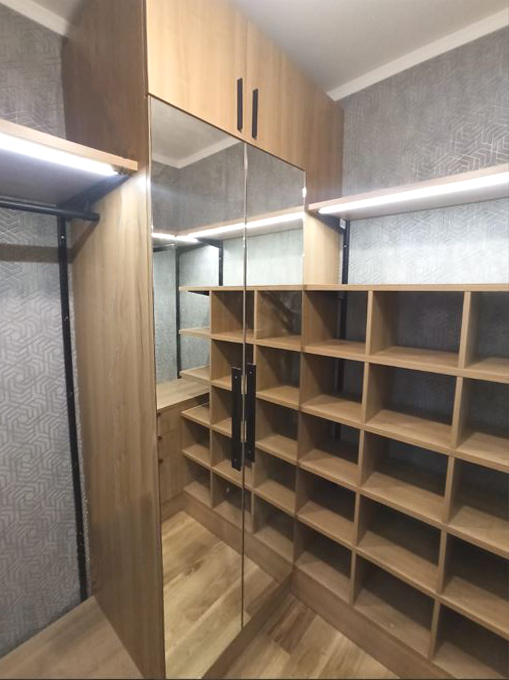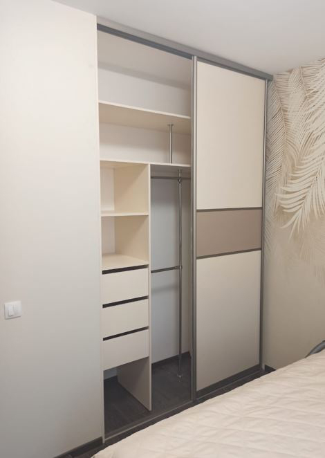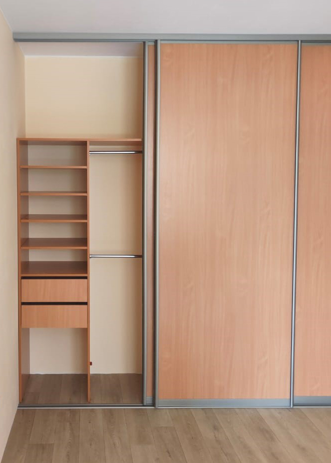 Серийная мебель оснащается несколькими полками и секцией для верхней одежды. Чаще всего эти полки не оптимальны по высоте, из-за чего впустую пропадает место, которое можно было бы задействовать для хранения вещей. Встраиваемые шкафы-купе на заказ по индивидуальным размерам – это хранилища, размеры и функционал каждой полки и ящика в которых тщательно продумывается. Если вам нужен совет по материалам и профилю, наш специалист объяснит все подробно.